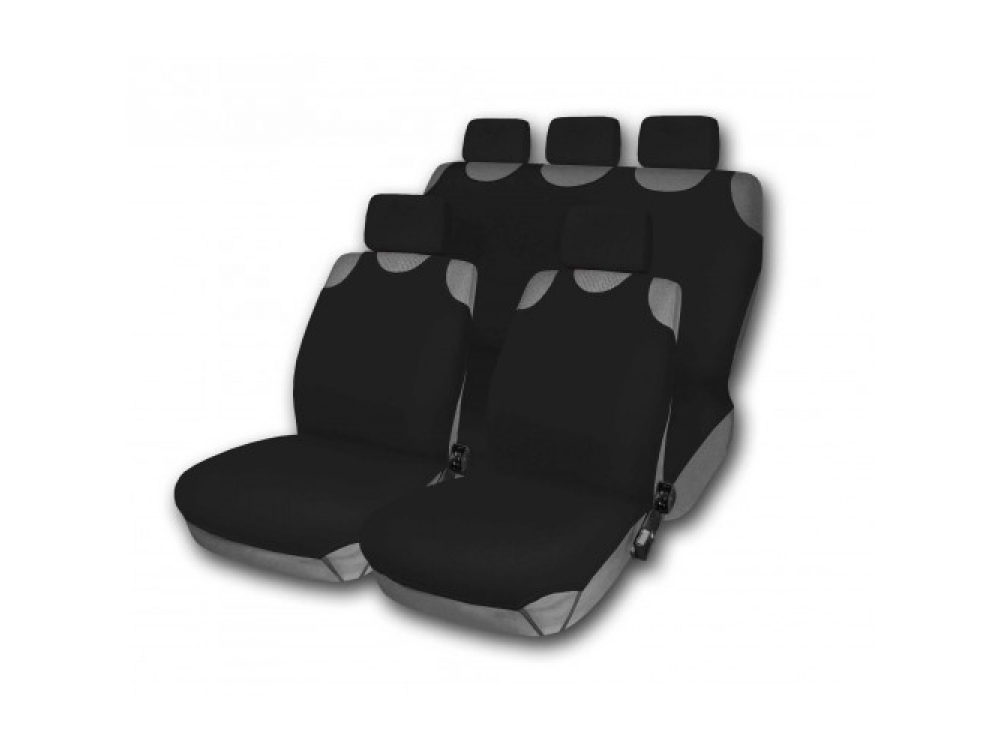 Комплект однотонных чехлов на автомобильные сидения. Тип майка. 9 предметов, включая чехлы на 5 подголовников. Универсальный размер, подходит на большинство современных автомобилей. Упаковка – сумка. Цвет - черный