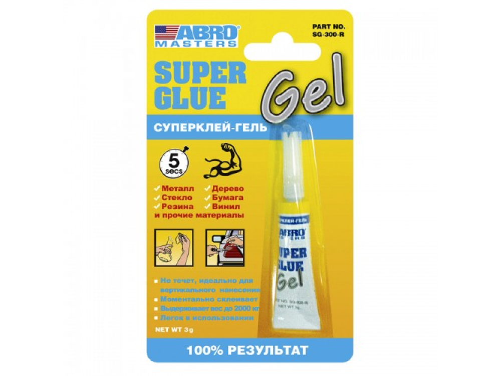 Суперклей-гель — клей на основе цианакрилата в гелевой форме. Идеален в случаях, когда кроме моментального склеивания необходимо заполнить поласти поврежденной поверхности. Сфера применения: суперклей-гель — предназначен для склеивания бумаги, кожи, пластика, резины, фарфора и прочих пористых и непористых материалов. Свойства: — новая высокотехнологичная гелевая формула; — не растекаетсяи не капает; — идеален для склеивания на вертикальных и пористых поверхностях; — схватывает за считанные секунды.