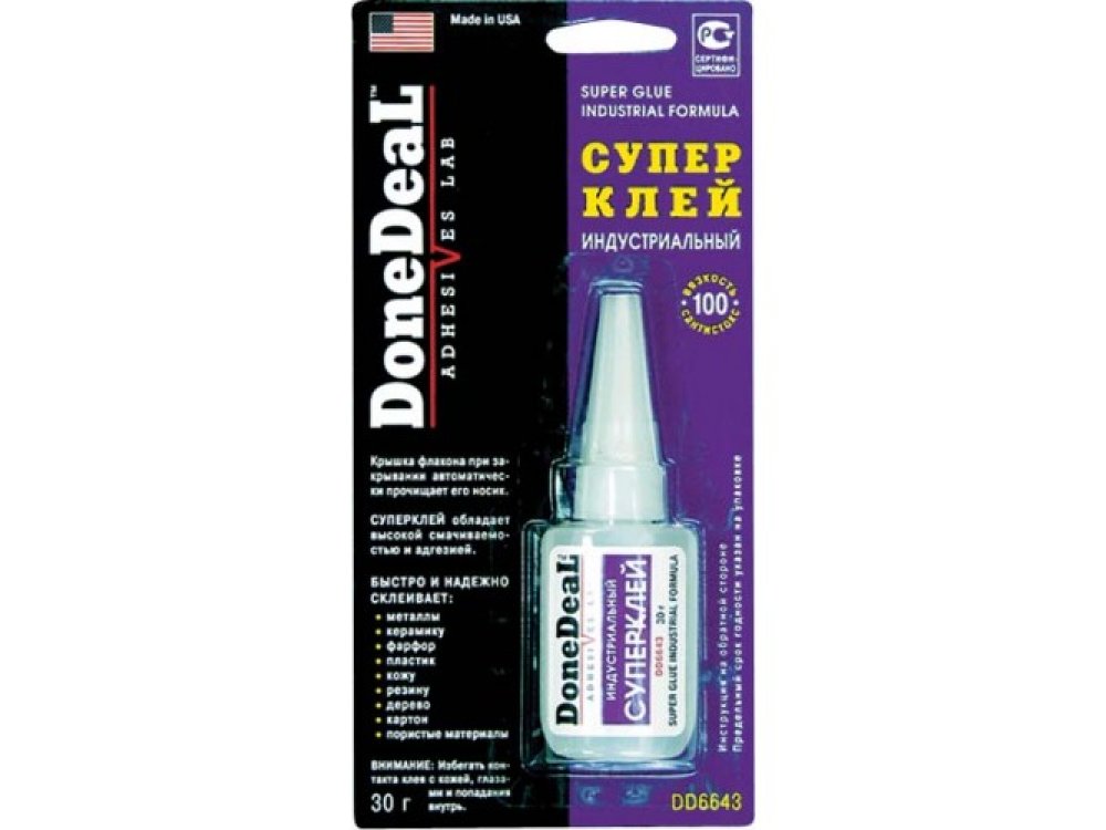 Индустриальный суперклей, обладающий высокими прочностными характеристиками, повышенной устойчивостью к агрессивным средам и перепадам температуры. Предназначен для быстрого и надежного склеивания различных материалов. Характеристики: Состав - цианакрилат. Цвет - прозрачный. Термоустойчивость - от -50°С до +95 °С. Прочность соединения - 204 кг/см2. Время схватывания - 40 сек. Время отвердения - 2 мин. Время полной полимеризации - 24ч. Область применения: Быстро и надежно склеивает: металлы; керамику; пластик; резину; фарфор; кожу; дерево; картон; пористые материалы. Особенности и преимущества: DD6643 высокой смачиваемостью и адгезией; выдерживает воздействие высоких температур и большинства агрессивных жидкостей; в крышку вмонтирована стальная иголка, которая при закрывании автоматически прочищает носик флакона и предотвращает застывание в нем клея.
