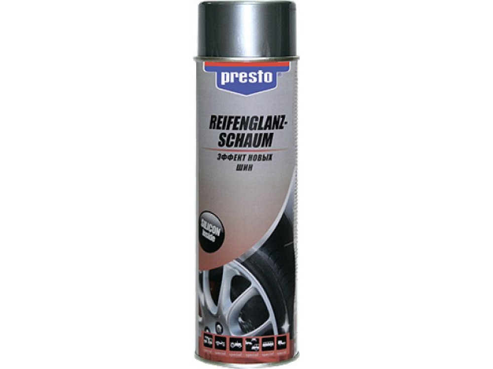 Профессиональная пенная формула PRESTO Эффект новых шин предназначена для высококачественной экспресс-очистки и обновления боковых поверхностей покрышек. Эффективно растворяет и быстро смывает все накопившиеся загрязнения. Формирует на поверхности резины защитную грязеотталкивающую полимерную пленку, обеспечивающую обрабатываемой поверхности ухоженный глянцевый вид новых покрышек. Не содержит растворитель.