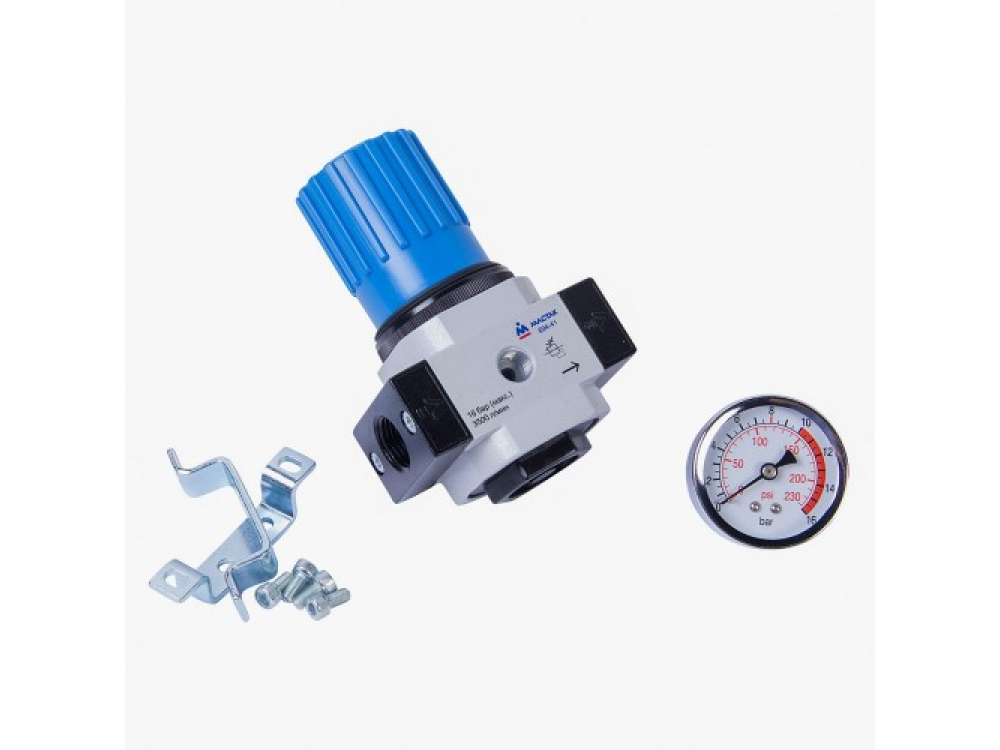 Манометр регулятор 1/2", МАСТАК 694-41 для регулировка давления сжатого воздуха в пневматической линии. Область применения: Автосервис, СТО. Конструкция устройства - Редуктор: выставление номинального давления на выходе, необходимого для нормальной работы инструментов и оборудования. Механизм редуктора встроен в блок фильтра. - Манометр: контроль давления, устанавливаемого редуктором. Манометр установлен на корпусе блока фильтра. Меры предосторожности - Соблюдайте правильность подключения в воздушную магистраль. - Не подключайте устройство к магистрали, давление в которой превышает максимально допустимое. Технические характеристики - Рабочее давление, бар 1,5 - 12 - Максимальное давление, бар 16 - Пропускная способность, л/мин 3500 - Рабочий диапазон температур от -10 до 60°С - Соединение, резьба вход/выход 1/2” внутр. / 1/2” внутр. - Габариты, мм 220х90х60 - Вес, кг 1,2