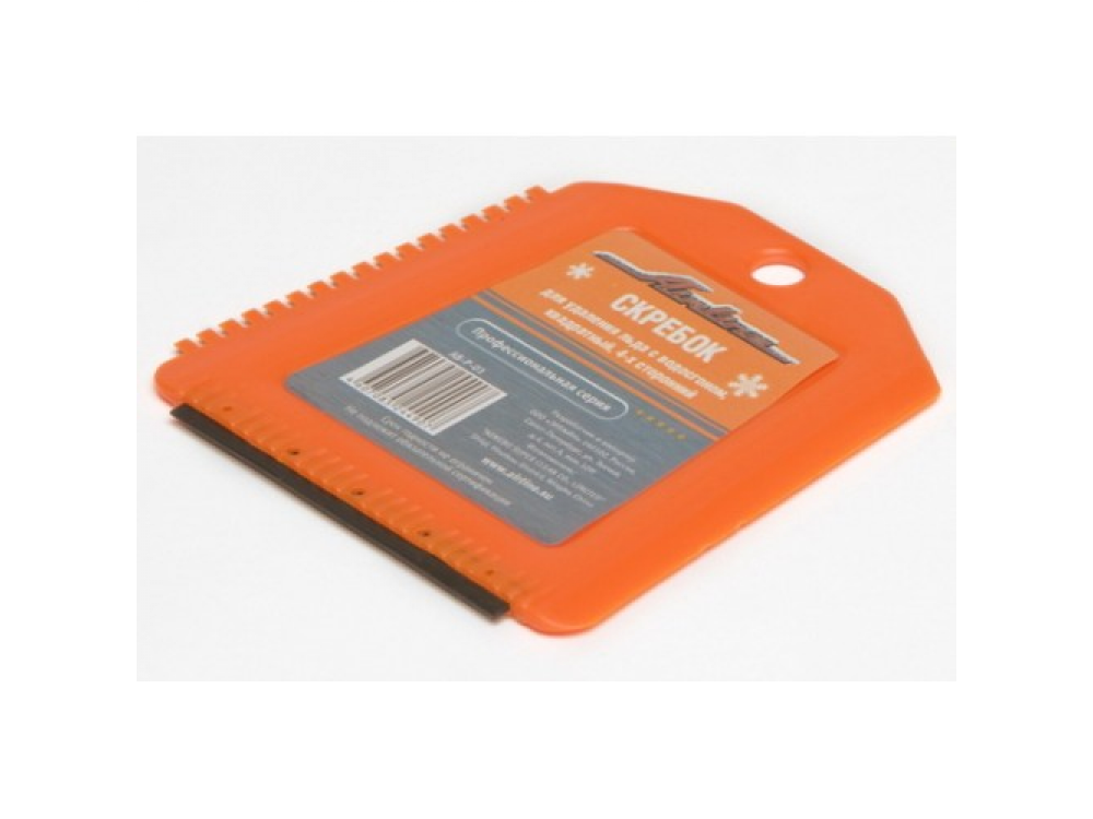 Скребок представляет собой изделие квадратной формы оранжевого цвета. На боковой и нижней части изделия расположены рабочие поверхности. Ребристая поверхность скребка позволяет удалить загрязнения или лед в сложно доступных местах, а водосгон устраняет разводы с корпуса автомобиля.