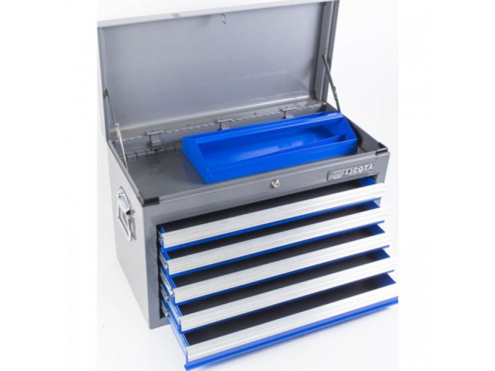 Инструментальный ящик, 5 полок Особенности: - Направляющие на подшипниках - Габариты: 660 x 307 x 427 мм - Размеры 4 полок: 569 x 275 x 50 мм - Размеры 1 полки: 569 x 275 x 75 мм